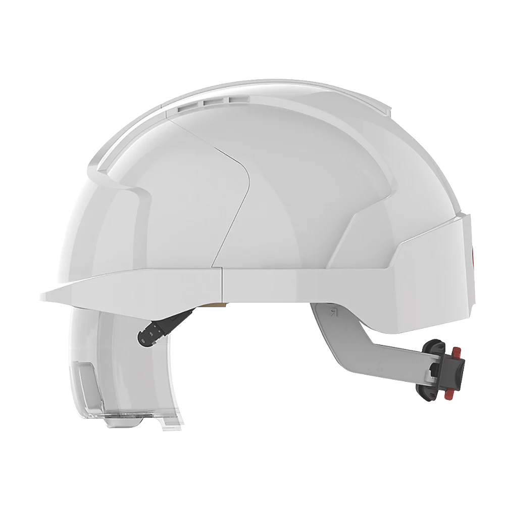 Casque de sécurité avec protection anti-rayures et antibuée. Pour une utilisation sur les installations basse tension. Protection fiable contre les chocs électriques jusqu’à 1 000V CA ou 1 500V CC. Le filtre UV fournit une protection contre les UV nocifs. Aucune pénétration dans la coque du casque. La déformation de la coque doit rester inférieure à 10mm.