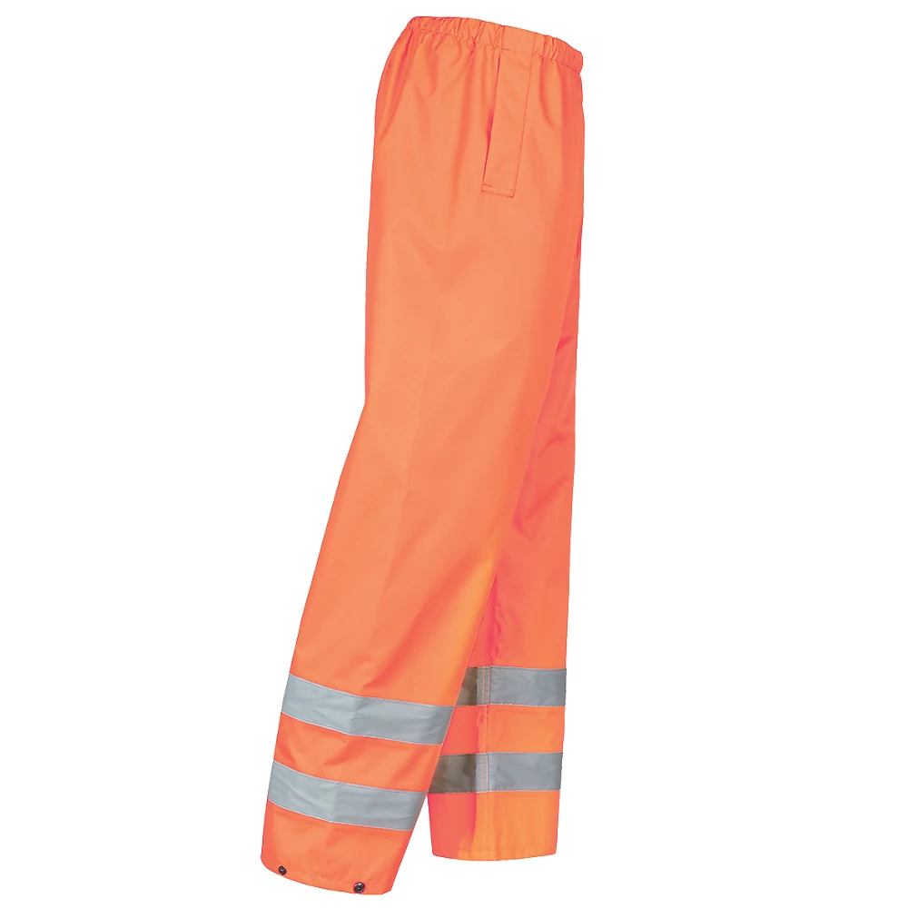 Surpantalon imperméable, léger et haute visibilité avec bande réfléchissante. Taille élastique, ourlet à boutons-pression réglable et 2 poches faciles d’accès (permettant d’accéder au pantalon). 190g/m².